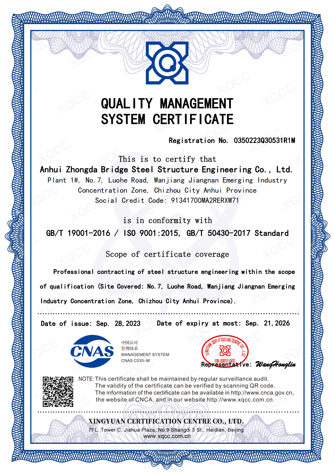 質(zhì)量管理體系認(rèn)證證書